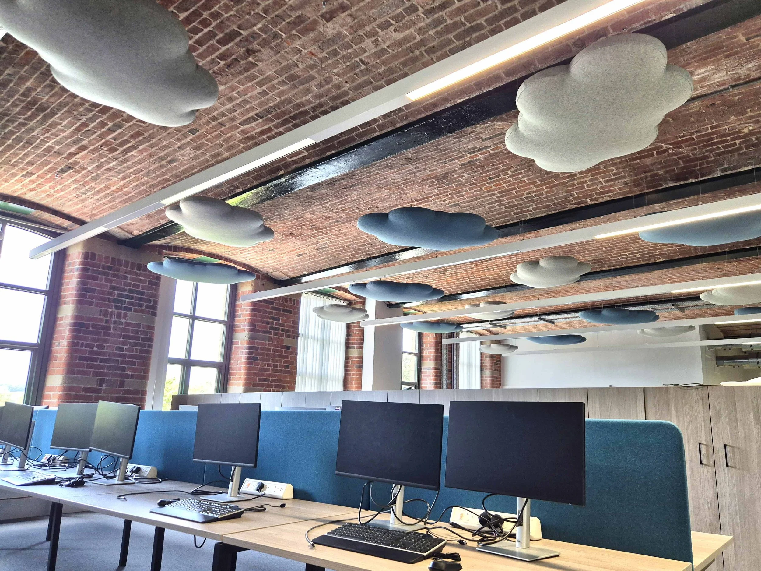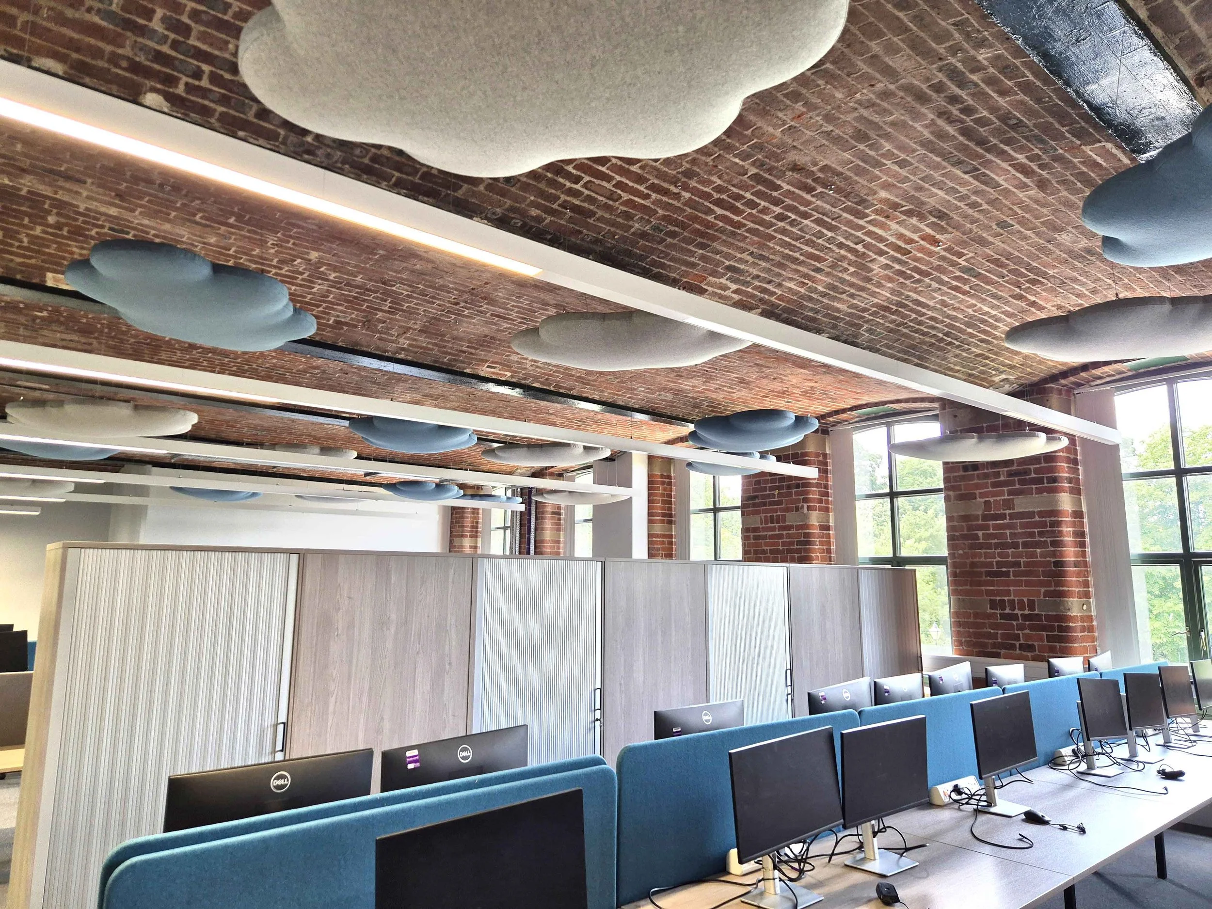 Our first project at New Mill involved installing a series of AgileCLOUD acoustic panels, which dramatically improved the sound quality and comfort within one of their busy collaboration spaces. The transformation was immediate — reducing reverberation, improving speech clarity, and creating a more inclusive, calming environment for staff to meet and work together.