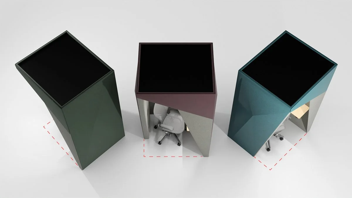 By rethinking the traditional phone booth format, we’ve removed the door and introduced angled forms to naturally create a wider, more accessible entrance. The result is a pod that feels more open, more inviting, and less enclosed—something we know can be important for users who are less comfortable in fully enclosed spaces.