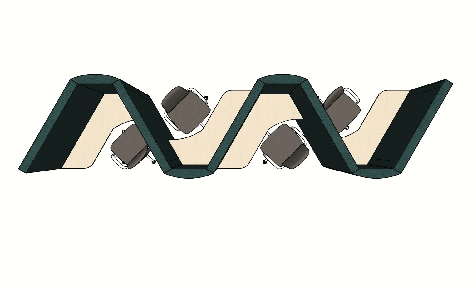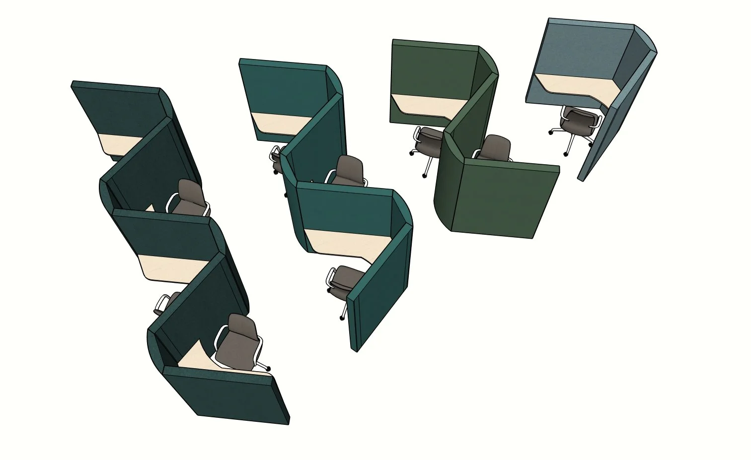 We’re currently developing a new triangular Space-Adjustable™ hot desking booth — a hybrid between a desk and an open pod. Designed as a 1-person focused workstation, the geometry allows multiple units to tessellate into 2, 3 or 4-person clusters without losing privacy, accessibility or spatial efficiency. Each unit creates a defined acoustic micro-zone — open at the top, lightweight in footprint, but substantial in performance.